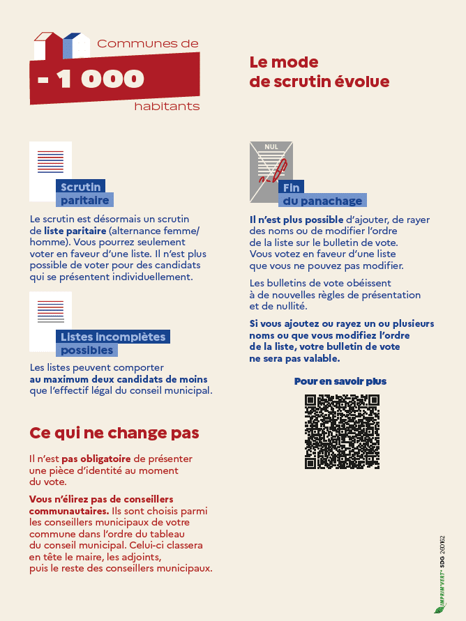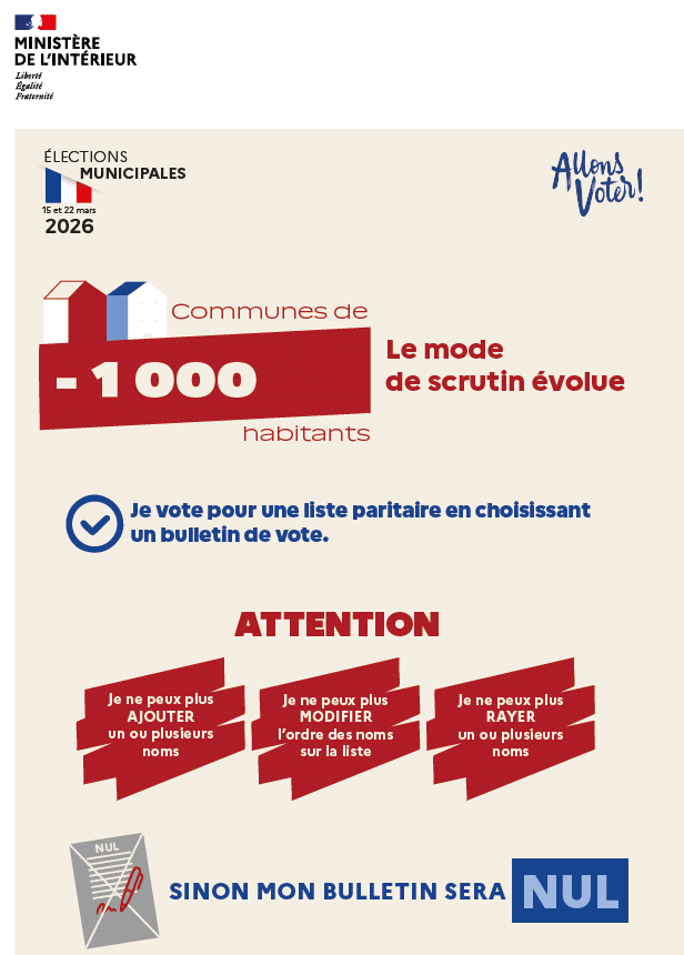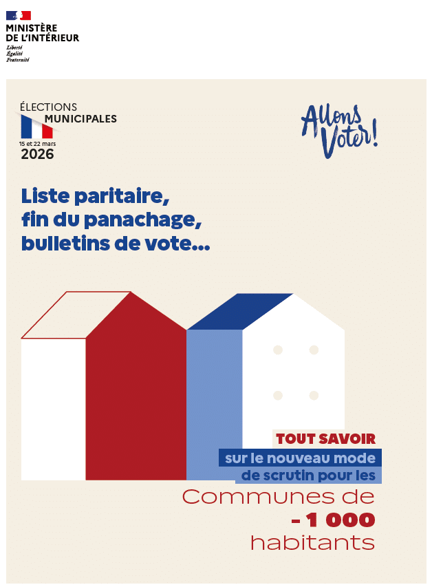 En application de la loi du 21 mai 2025, à partir des élections municipales de 2026, le mode de scrutin dans les communes de moins de 1.000 habitants est un mode de scrutin de liste paritaire comme c’était déjà le cas dans les communes de 1.000 habitants et plus.